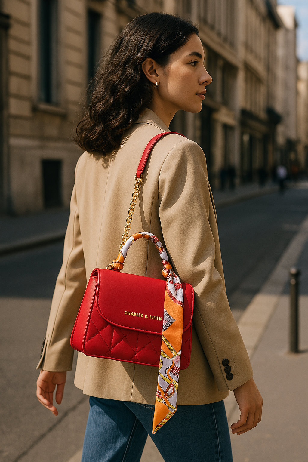 “Red quilted street-style handbag on city sidewalk, adjustable strap”